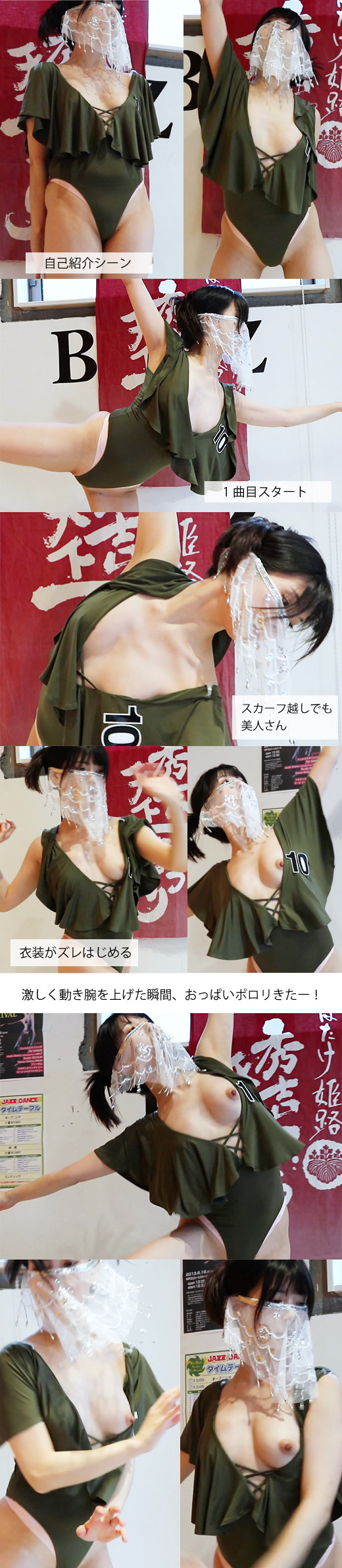 description : 今回は過去1でヤバイお宝ハプニングです! もちろんどこにも出てない、初だし映像です!! 地元のとある祭りの1つの企画で、JAZZダンスサークルの演技イベントがありました! JAZZダンスだけじゃなく、となりの会場ではローカルアイドルのLIVEなどもしてる感じ。 どれを撮影しに行こうか悩みましたが、イベント会場裏で待機しているダンサーたちの衣装を見た時に、このJAZZダンス会場に決めました!! JAZZダンスって、いまいちどんなダンスか分からなかったのですが、セクシーなレオタード系衣装を着ているダンサーがちらほらいたのです! これは!!と思い、最前席を確保し、待機。 10数組くらいが演技するようです。 全てのダンサーの演技を撮影しましたが、 今回はその中でも”お宝ハプニング”が起きたダンスパフォーマンスを販売します!! マジですごいです! この女性ダンサー、衣装がきわどいです! 胸元部分が大きく開いていて、とてもセクシー! ポ口りを期待させてくれます! そして、股間部分もかなりハイレグ! ピンクーのインナーがはみ出ていますが、まんまんが見えそうなレベルの角度! そして、おしりのほうもかなり食い込んでいて、後ろを振り向く度にプリケツが拝めます! 顔には、異国のダンサーがするような半透明のスカーフを巻いてるので、 顔ははっきりとは確認できませんが、 雰囲気や目元、スタイルの良さからも、美人であることは一目瞭然です! これなら、特定の心配はないと思い、販売することにしました。 ちなみに、参加者全員がこんなエロい衣装だったわけではないですが、数人、セクシー系のおっぱい強調衣装を着てました!! 機会があれば、そちらも出したいと思います。 観客は、〜20数人くらいでした。 □動画のもくじ 0:01〜 女性司会者がダンサーの紹介をしてるところから始まります。 0:07〜 ダンサーの女性登場&の自己紹介。 「練習の成果を発揮できるように頑張ります」とのこと。 プロではなく、個人参加のようです。 0:22〜 1曲目、ダンススタート! 海外のJAZZ曲らしく、曲名は分かりません。 ゆったりとしなやかな振り付けで流れるような動き。 イメージ的にはアイススケートのような感じで、手を広げ、回転したり、足を上げたりなど、ゆったりですが、意外と激しく動いてる感じ。 艶かしい雰囲気を表現してる感じです。 ダンスは素人くささはなく、プロのような上手さです! 1:18〜 勢いよく回転したせいで、おっぱいが激しく動きます! 胸元がどんどん開いていき、 そして乳輪がちらり!! もう、序盤からハプニングの予感が漂ってました! 乳輪がチラ見えした状態でダンスは続き、 そして… 1:32〜 いきなりキターーーーーーーーーー!! 腕を回転させた影響で、衣装の肩部分がずれ下がり、右のおっぱいがポXX!!! Eカップはありそうなお椀型のおっぱい!!形がエロイです! そして、乳首がツンと勃ってます!! 白い肌にこの乳首は、映えます!! ポXXしてるのに10秒ほど気づかず、ダンスの振りは続いてます。 1:41〜 ポXXしてることに気づき、衣装を瞬時に戻します。 慌てる様子を見せず、何もなかったように、ダンスは続いていきます!! ここのポXXからの衣装直しの一連の流れがマジでエロいです!! 2:14〜 振り付けの関係で、背後を向きます! プリケツがじっくり拝めるのですが、おっぱいもエロいですが、尻もエロい!! それから、おっぱいとお尻ばかりに目が行きがちですが、ハイレグのエロさも忘れてはいけません。 ってか、なんでインナーが見えるようなハイレグ衣装を選んだんだろう。 しかも、清楚で大人しそうな雰囲気の女性なんで、ギャップがエロいです。 ちなみにプリケツは回転する度に何度も見れるので、目次からは割愛します。 2:35〜 乳輪ちらり! 乳首の半分くらいまで見えてます! 乳輪までは、回転するたびに、何度もチラチラ見えてますが、 100%乳首までは、そうそう何度もポXXしてくれません。 3:07〜 衣装がちょくちょくずれ下がるので、ズレを直しながら踊ってる感じ。 3:20〜 1曲目のダンス終了です。 観客から拍手。 となりの会場のイベントが少々うるさいです。 3:24〜 2曲目のダンスがすぐに開始。 曲は戦場のメリークリスマスでした。 4:19〜 2度目の乳首ポXXきたーーーー!! 1秒ほどですが、完全に乳首が見えました! もう片方の乳首は、衣装越しにチクぽちしています! 一瞬だったので、ダンサーも気づいてないようです。 4:30〜 その後も、きわどい状態の衣装で踊り続けてるせいで、乳輪が4割くらい見えた状態で踊ってます! 5:45〜 おしいーーー! あと1cmでポXXしそうだったんですが、乳輪ちらどまり。 7:11〜 そしてそしてー、2度目の衣装ずれキターーーー! 肩から衣装がずれ落ち、おっぱい丸見え状態に!! すぐに気づき、一瞬で衣装を直されてしまいましたが、完全ポXXが撮れました!! その後も、動揺を見せず2曲目終わりまで踊り切りました。 8:27〜 乳輪チラシーンと乳首ちらシーンを、スローにしてまとめてあります。 今回は女性ダンサーの身バレのリ